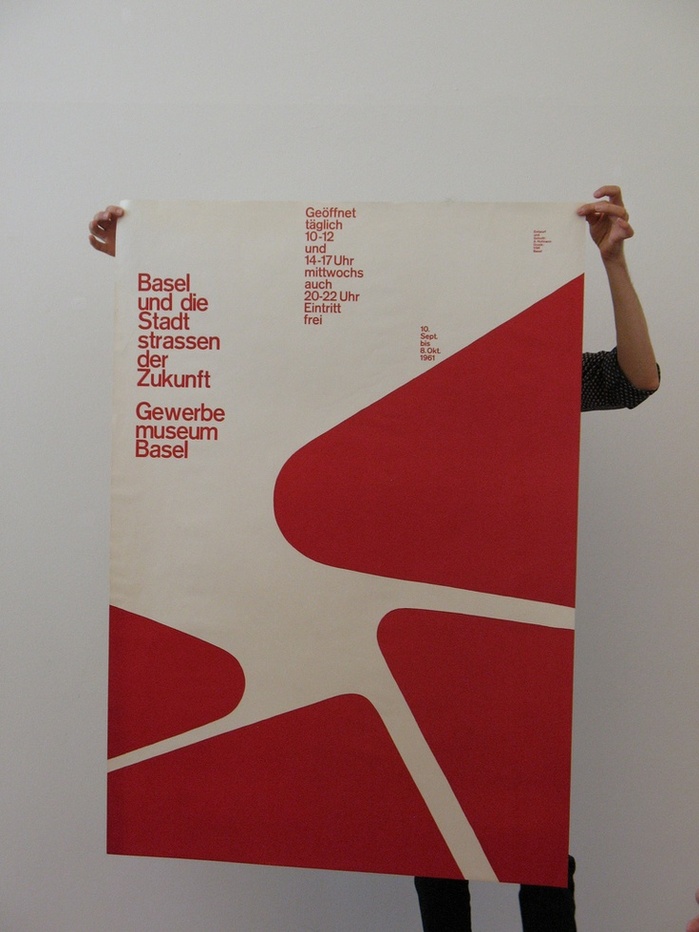 Armin Hofmann designed this 127×90 cm poster for a 1961 exhibition at Gewerbemuseum Basel entitled Basel und die Stadtstrassen der Zukunft (“Basel and the urban roads of the future”).