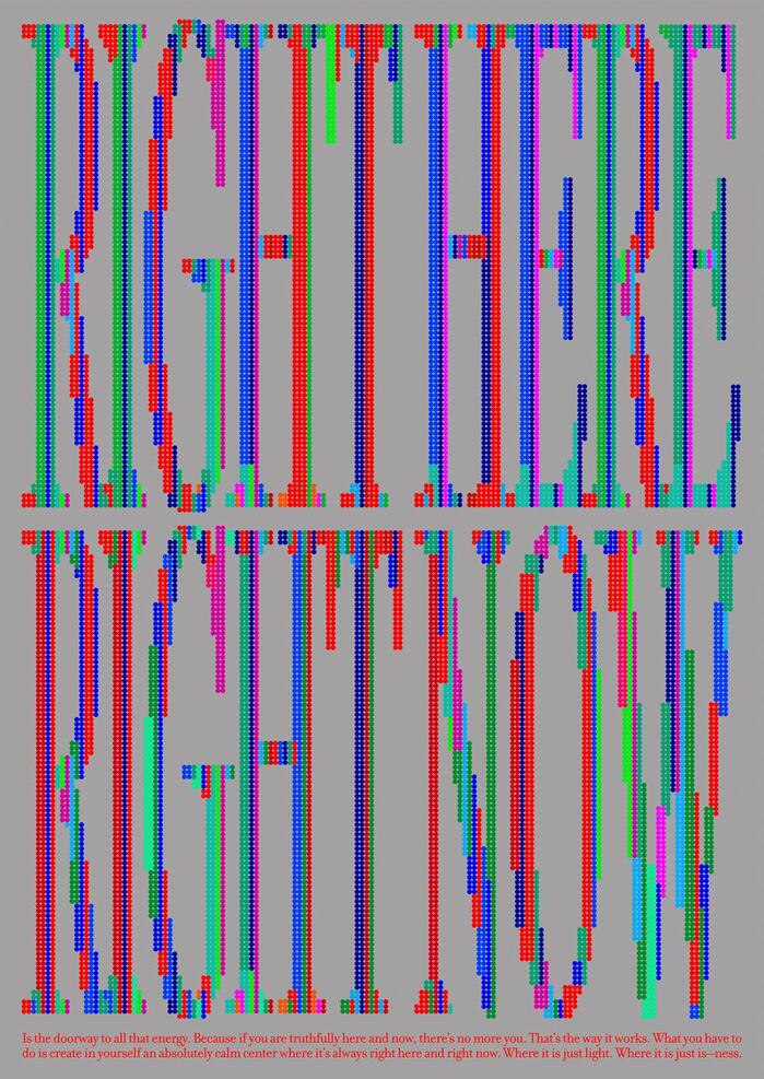 At the lower edge of the composition, two lines of text run horizontally across the design. This typographic element reinforces the conceptual message while introducing a chromatic counterpoint to the dominant vertical structure.