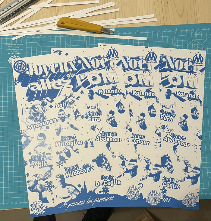 “Joyeux Noël et allez l’OM” (“Merry Christmas and go OM!”) is a monochrome cyan poster paying tribute to a selection of players who have passed through Olympique de Marseille over the years. Rather than ranking or judging them, the poster treats these figures as part of the club’s collective memory, players who, for better or worse, contributed to shaping its identity.