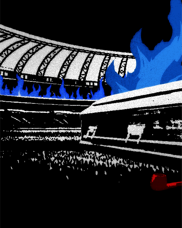 In the first match of the final, Grêmio defeated Internacional 3–0 at their home stadium. The decisive match would take place at Internacional’s stadium. In the background of the image appears the Beira-Rio Stadium in blue flames, referencing an event that occurred in the 2000s when Grêmio supporters set fire to parts of the stadium during a derby. The coffin with three arrows alludes to Grêmio mascot, the Flecha Negra (“Black Arrow”), symbolizing that the outcome of the final had already been decided in the first match — as if the coffin had already been closed. On the ground there is a red pipe representing what would remain of Internacional’s mascot, the Saci-Pererê.