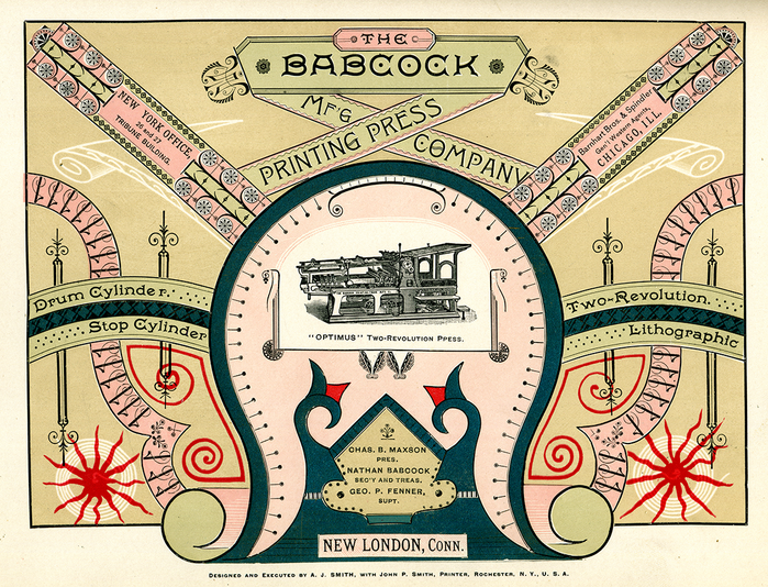 The Cottrell & Babcock Manufacturing Company was founded in 1855 in Stonington, Connecticut. In 1880, Nathan Babcock purchased the shares of co-founder Calvert Cottrell and set up a new printing press manufactory together with his nephew George Fenner. Renamed the Babcock Printing Press Manufacturing Company, it was moved to New London. Around 1886, Babcock introduced the two-revolution “Optimus” press. From Steve Fithian’s 2024 article for Otis Library: