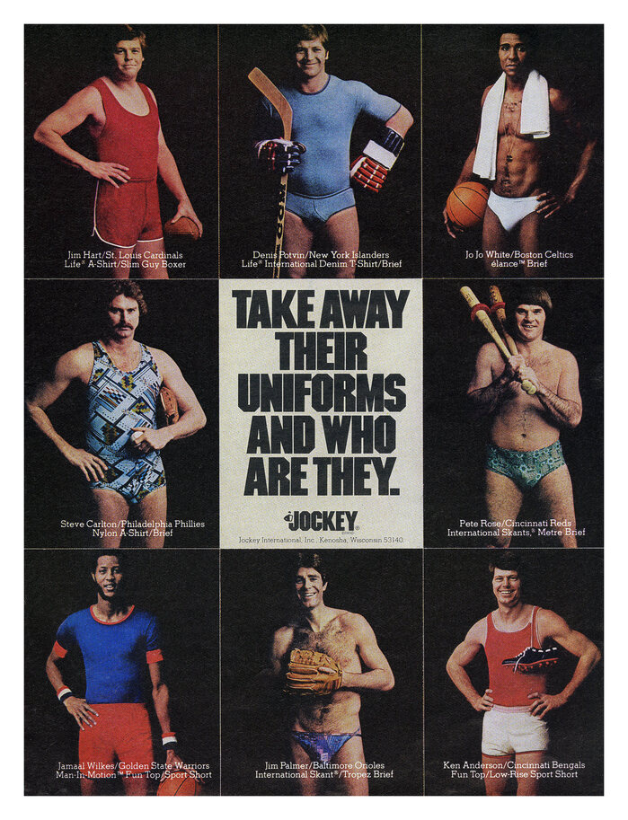 1977 ad for underwear by Jockey International, Inc., starring a roster of stripped-down jocks – Jim Hart, Denis Potvin, Jo Jo White, Steve Carlton, Pete Rose, Jamaal Wilkes, Jim Palmer, Ken Anderson – and one staple of 1970s typography, ITC Machine.