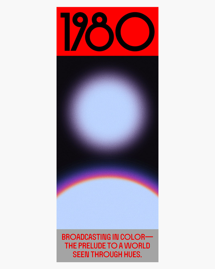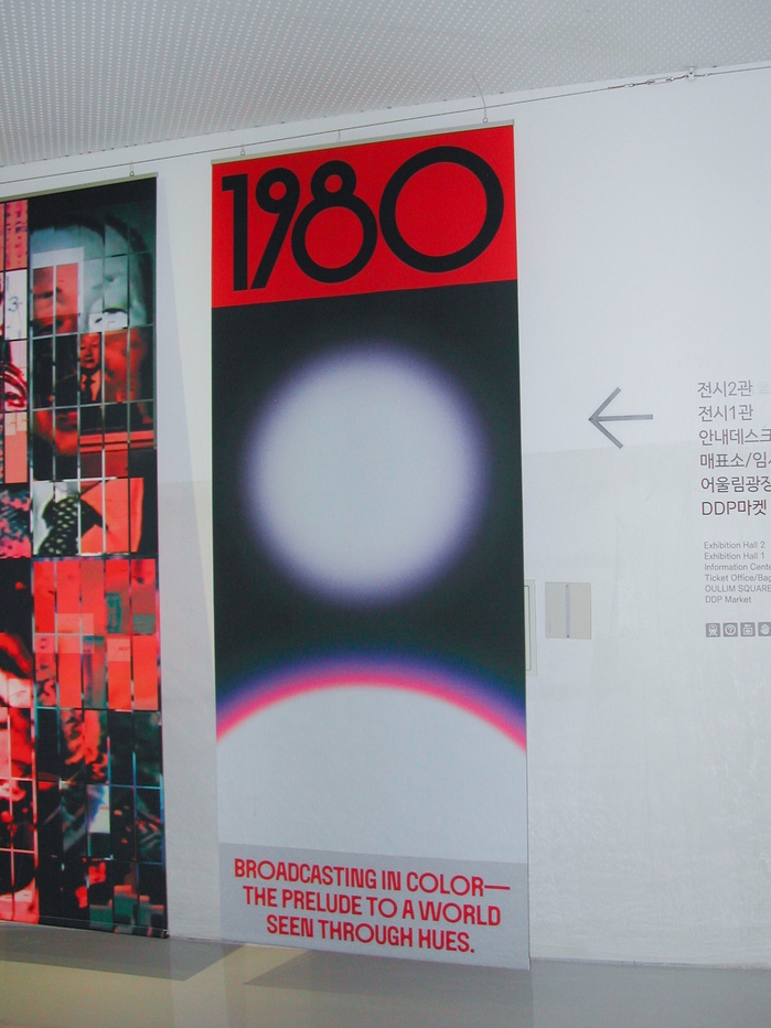 Design studio HyperPension created a poster for the exhibition 198X, organized by the Design History Society of Korea. The exhibition revisited the 1980s through the lens of creators born in the 1990s and later, especially in the section titled “Young Eyes, 198X”. The assigned theme for this poster was “The Dawn of Color TV in 1980”. In Korea, color television broadcasting officially began that year.