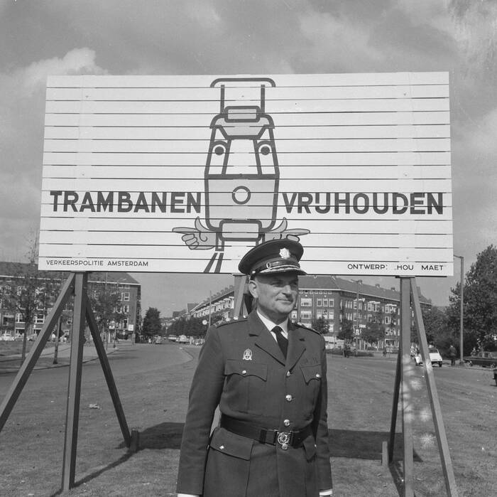 Police Chief Van der Molen in front of a new information sign at the approach road Sloterweg in Amsterdam, August 27th, 1965. In this version, the message doesn’t use any type, but is lettering, and in all caps, featuring a compact IJ digraph.