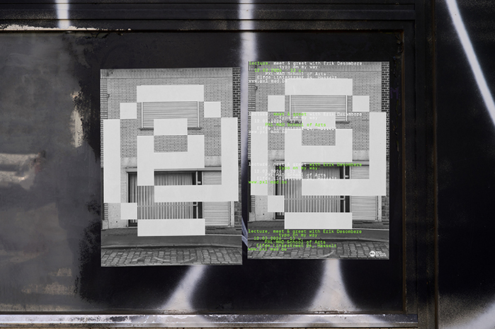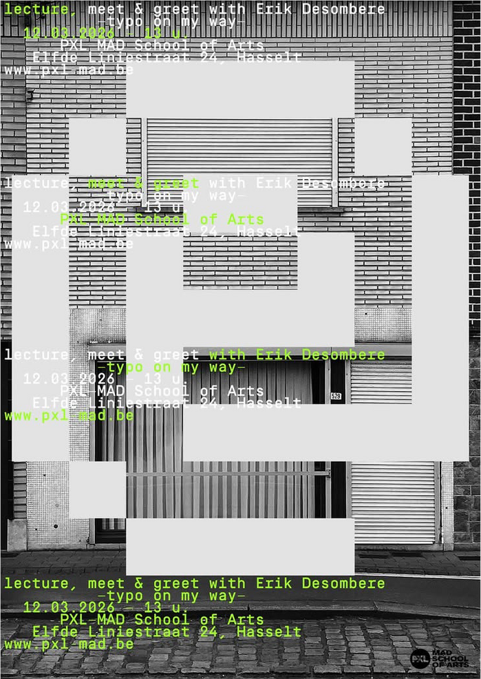 A poster for my lecture at PXL MAD School of Arts in Hasselt, Belgium, using an image that’s part of the lecture and my personal e logo.
