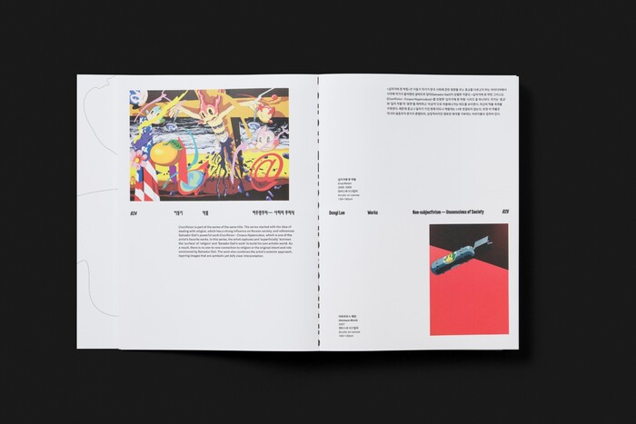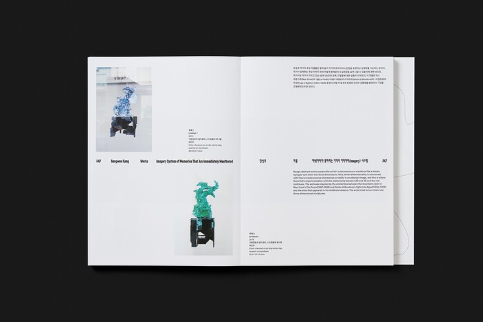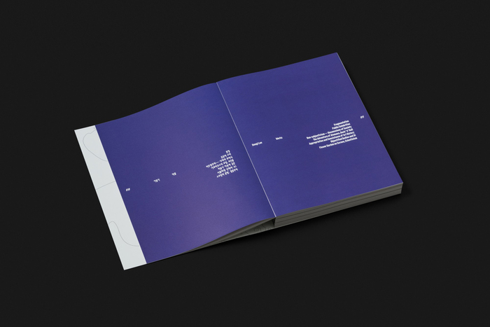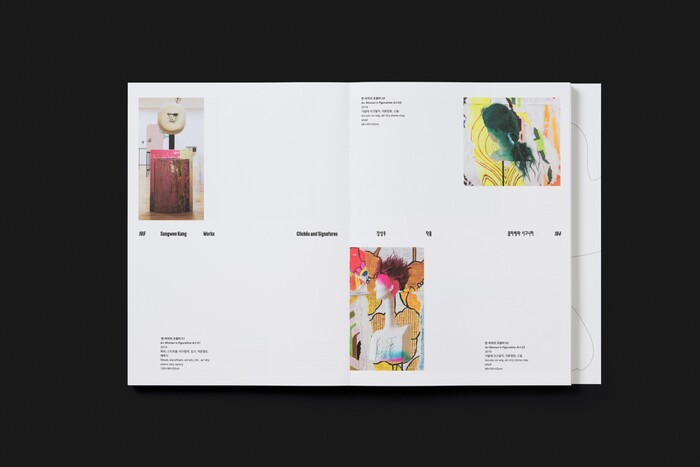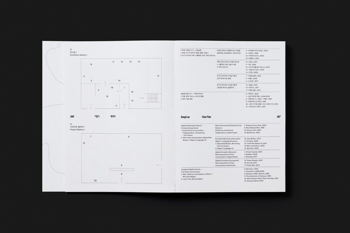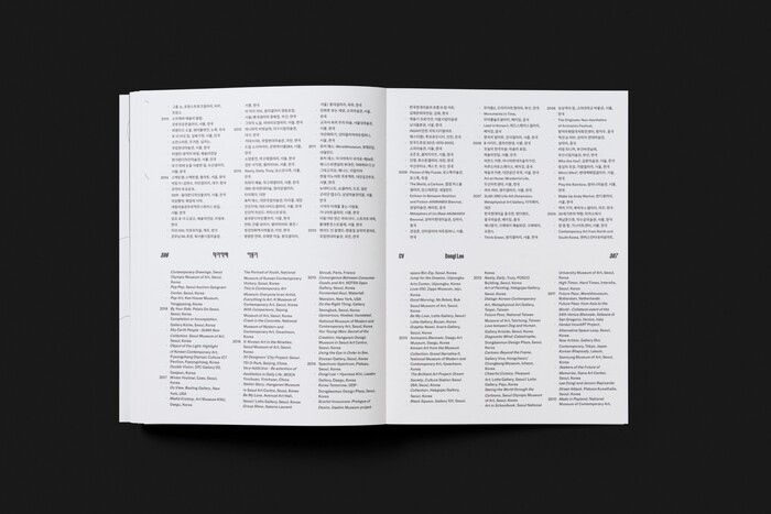 The design combines contemporary Latin and Korean typefaces to support the exhibition’s layered narrative. Farmacia by Nguyen Gobber is used for English titles across both the exhibition graphics and the book, adding a distinctive visual character to the design. Aktiv Grotesk KR by Dalton Maag serves as a secondary heading typeface for English and Korean in the exhibition graphics, providing clarity and consistency across languages. In the book, Korean headings are set in AG Madang Display by the AG Typography Institute, while GT America by Grilli Type is used for Korean and English body text.