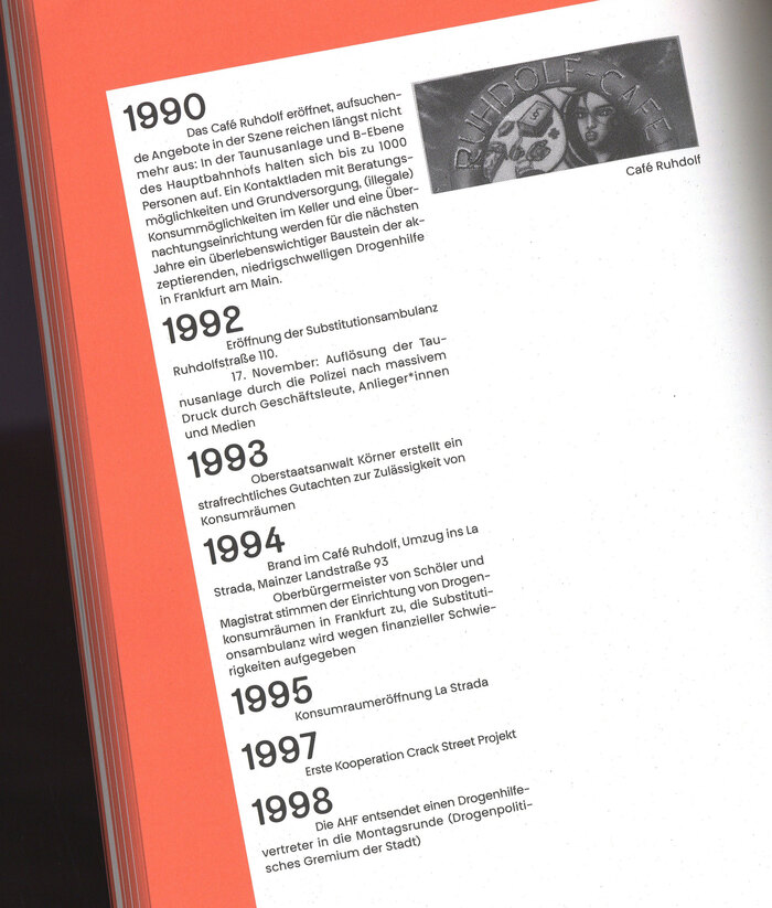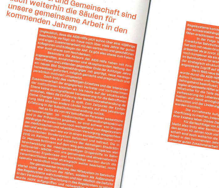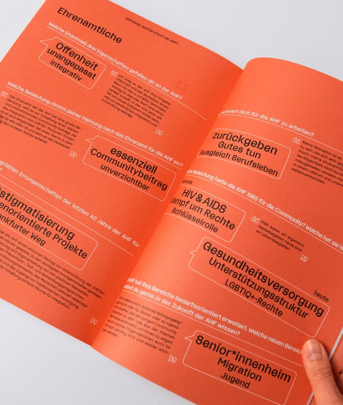 For its 40th Anniversary, the AIDS-Hilfe Frankfurt published a comprehensive book, celebrating four decades of fighting for visibility, justice and human rights of vulnerable groups and detailing its founding, development and impact: