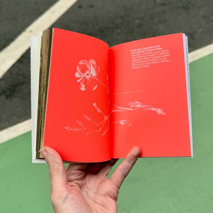 Functioning as a poetic visual-textual essay, the book unsettles the familiar logic of travel guides and the explorer’s gaze. It troubles the impulses of sightseeing, navigation, and tourism, while calling into question the authoritative languages of archaeology, botany, taxonomy, and cartography. It emerges from ongoing inquiries in Nour Bishouty’s practice around permission, legibility, and understanding.