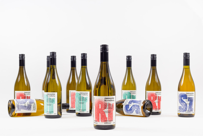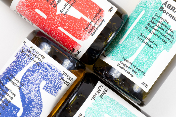 Submachine is a graphic design studio based in Budapest. For Ábrahám Borműhely wines, they designed distinctive labels, using Norbert Schmal Fett by Philipp Neumeyer as the primary visual motif and Triptych Grotesque by Ellmer Stefan (The Pyte Foundry) for normal-sized text.