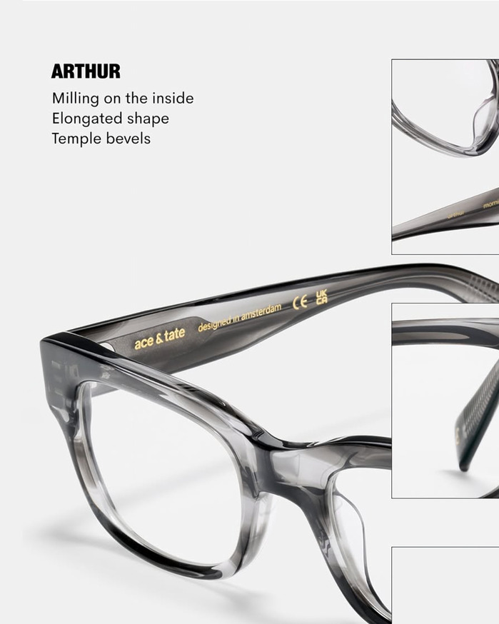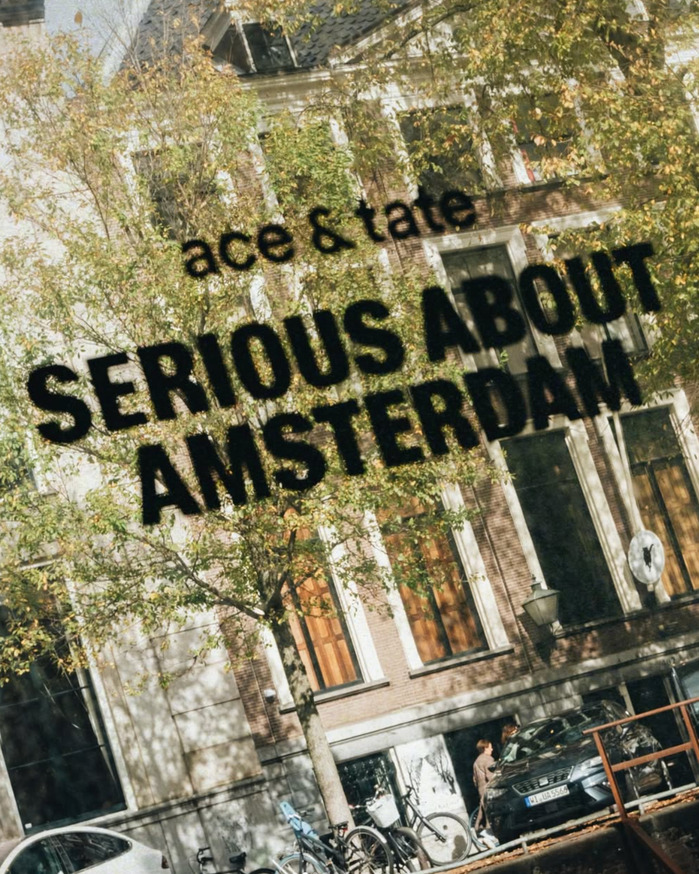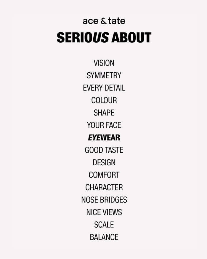 Secondary text is set in Ace & Tate’s custom typeface Amper Sans.
