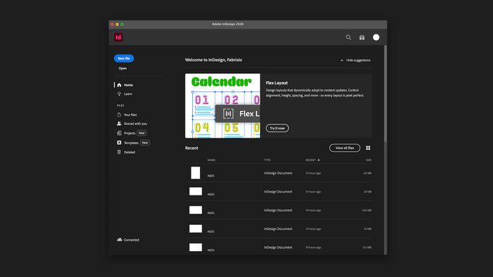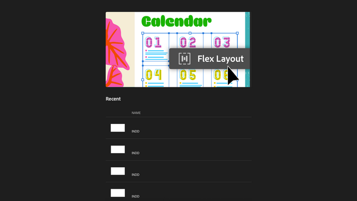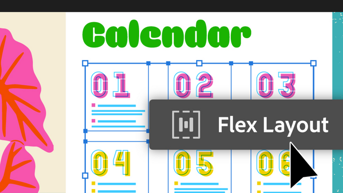 Burghi is used in Adobe InDesign 2026 to illustrate the Flex Layout feature. The calendar numerals are from CoFo Kabeltouw. Adobe Clean is the typeface used for the interface typography.