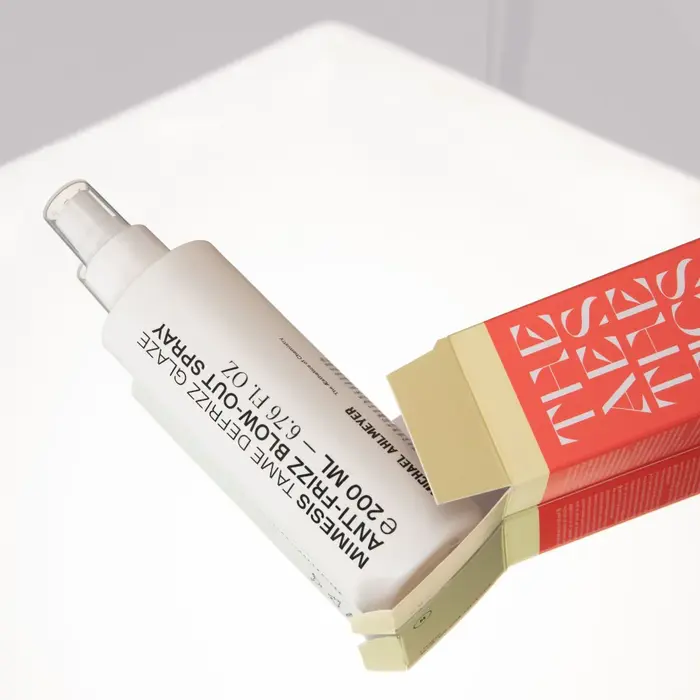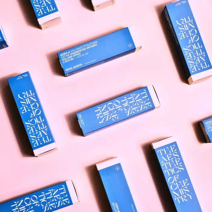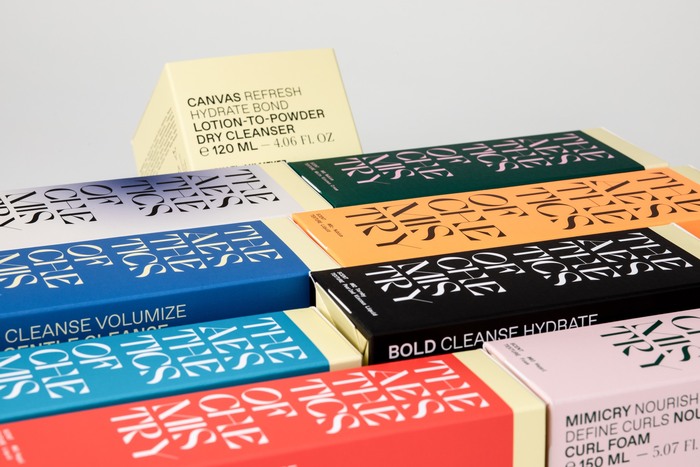 Packaging for a haircare line by Michael Ahlmeyer, featuring Cosi Azure (Nikolas Type) in large display settings, accompanied by ABC Favorit and an unidentified serif typeface.