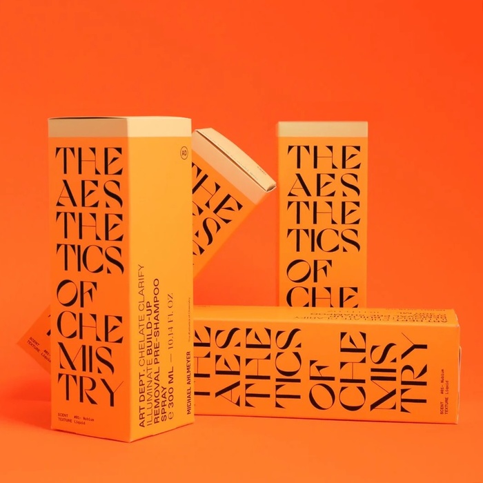 Across the cartons, stacked type compositions form the phrase “The Aesthetics of Chemistry,” establishing the primary graphic element of the series. Vivid product colors vary throughout, while the typography remains the constant.