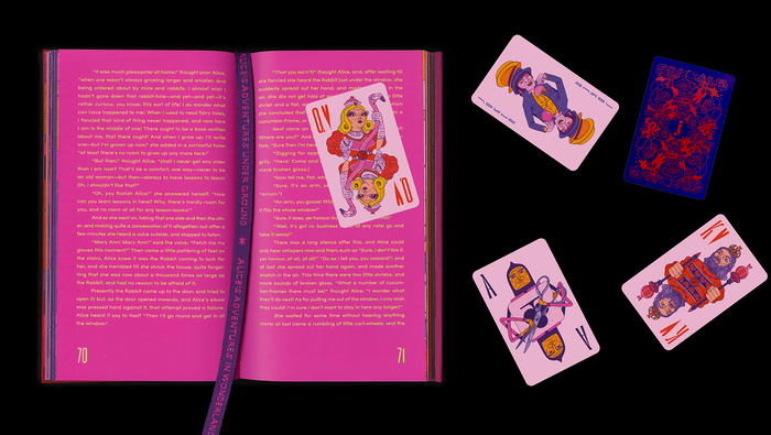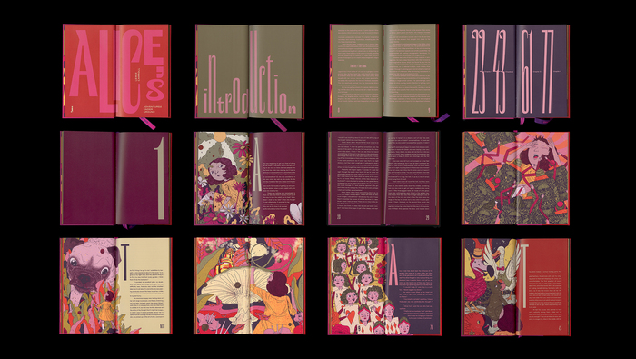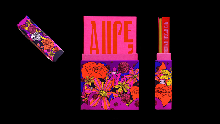 Jhambo Ink, a boutique publisher in London, brought out a limited edition in 1,000 hand-numbered copies of a double book bringing together Caroll’s Alice's Adventures Under Ground and Alice In Wonderland. Ana Santiago of Index designed the two books joined by their spines in a dos-à-dos binding. The book is richly illustrated by Brazilian artist Zansky.