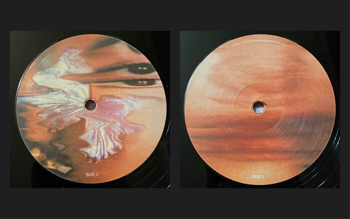 The vinyl record design is composed of four panels; with the front cover showing the main photo artwork that’s also used on the T-shirt. The back cover has lettering with the title of the EP, El Jardín de Lágrimas, and finally the inside contains the lyrics and a photo of the artist as an angel.