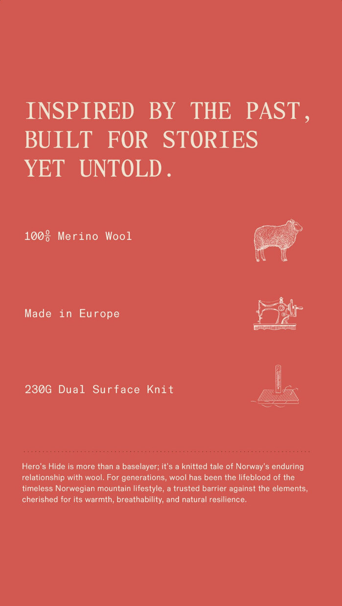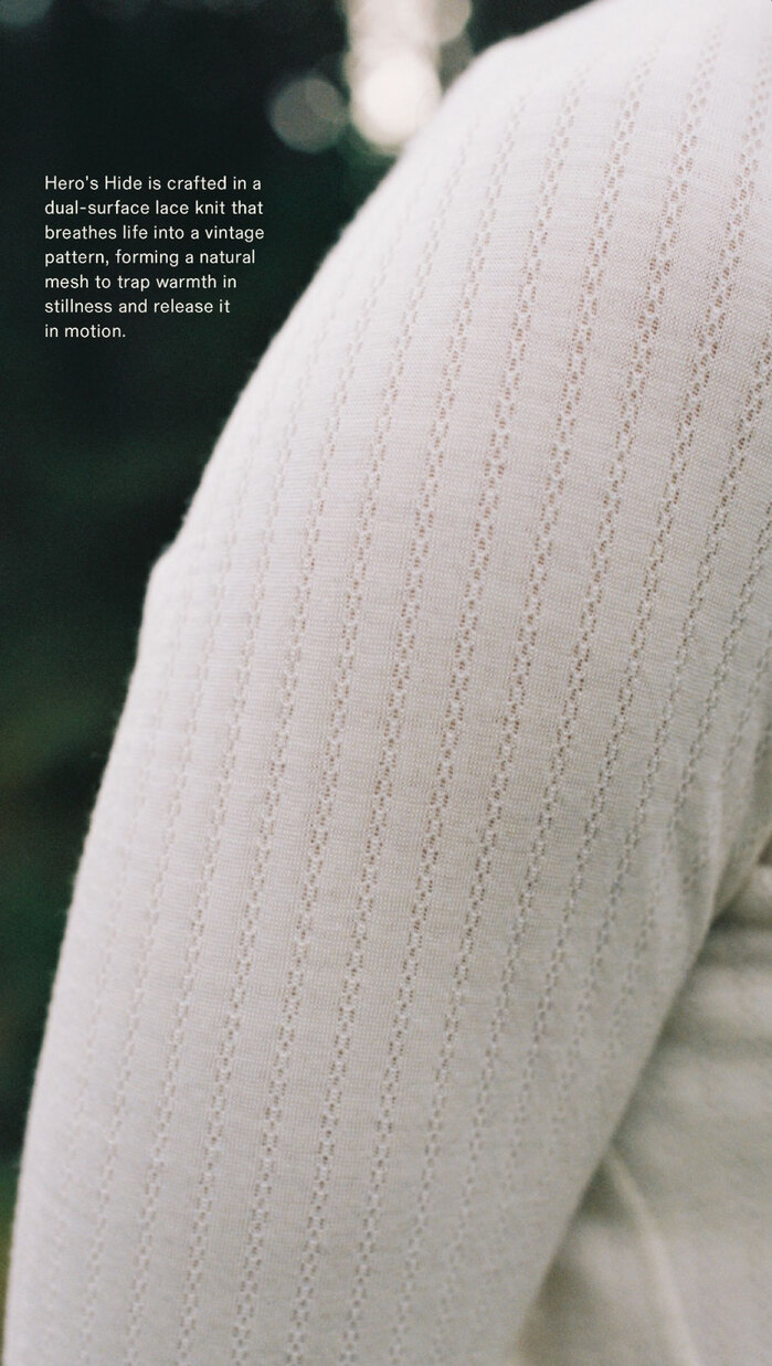 For “Hero’s Hide”, the unique Dual-Surface SkipStitch Knit technology creates an ultra-light base with a distinctive openwork pattern, combining warmth and breathability. This design pays homage to the refined Norwegian mountain lifestyle, reimagined for those who embrace adventure year-round.