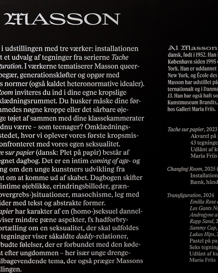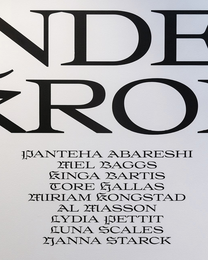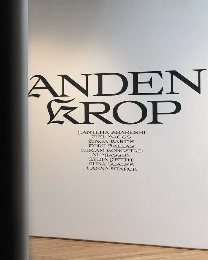 Graphics for the exhibition Anden Krop (English: Other Body) at Fuglsang Kunstmuseum in Toreby, Denmark, curated by Liza Kaaring and Tore Hallas. Spine Studio used Place together with Rhymes. Place is used with the blackletter capitals from its Extra styles. The exhibition architecture is by Louise Witthöft.