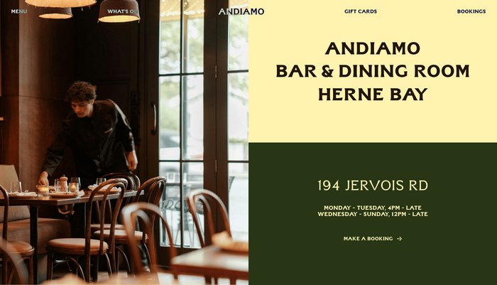 The challenge was to modernise the identity while staying true to its history and local roots. The refresh introduces a new wordmark grounded in heritage and sophistication, alongside a refined palette of rich greens and buttery yellows. Together, these elements bring warmth, confidence, and renewed clarity to the brand. The result is a considered evolution, honouring Andiamo’s past while setting it up for its next chapter on Herne Bay’s main strip.