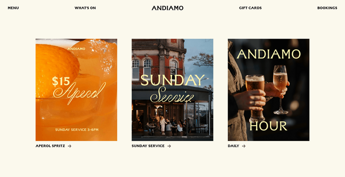 Andiamo is a neighbourhood bar and eatery in Herne Bay, a suburb of Auckland, New Zealand. They recently partnered with Studio 024 to reinvigorate a much-loved legacy brand, using AF Stelios by Abbr. Foundry as the main typeface, including for the wordmark. It is used together with Sharp Type’s Cordier Script.