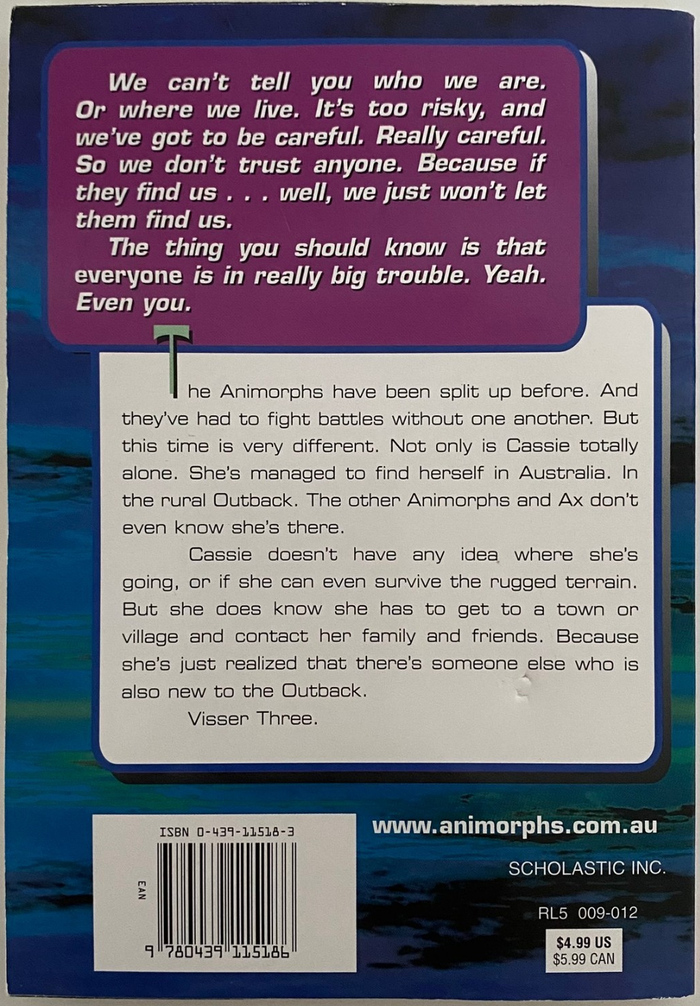 Later printings may have a promotion for the TV series adaptation (which aired from 1998 to 2000) on the front cover. One version has the text “Watch Animorphs on Nickelodeon” in Template Gothic Bold and Escalido Gothico, and “TV” in Graham Bold; another has “Watch Animorphs on TV” in Eurostile, Ramiz, Template Gothic and Escalido.