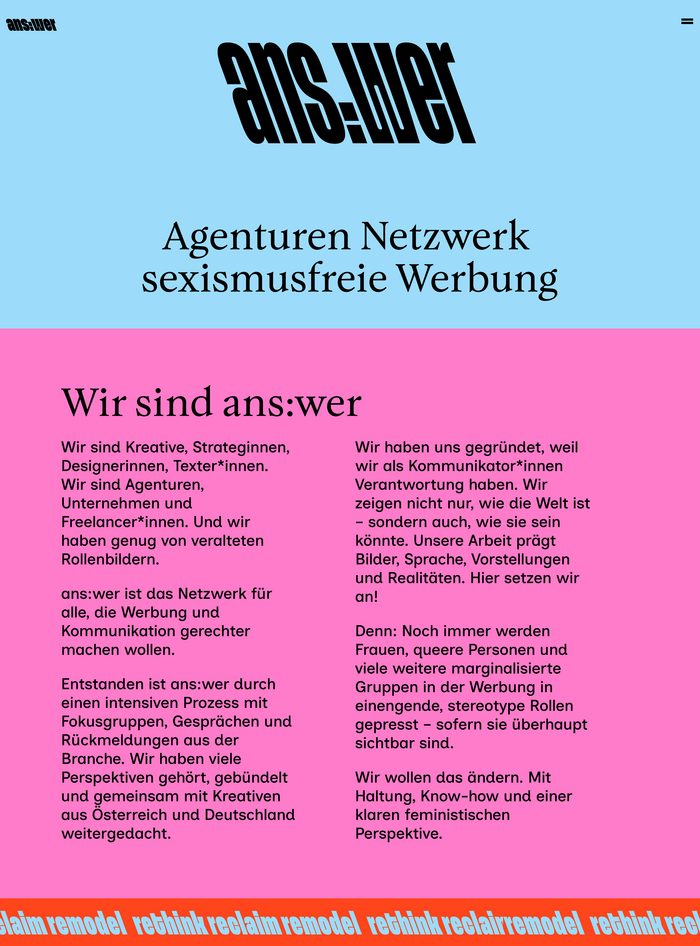 ans:wer is a platform for agencies, companies, freelancers and in‐house communication teams who want to work towards advertising and communication that’s free of sexism and discrimination. From the website (translated from the German):