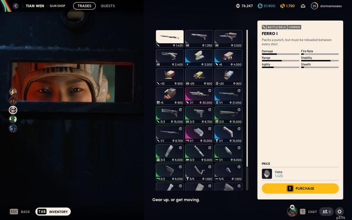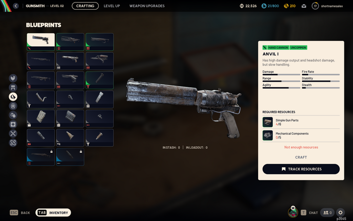 Viewing the Gunsmith, one of six other work stations where players can craft guns and items from resources that they have scavenged during raids