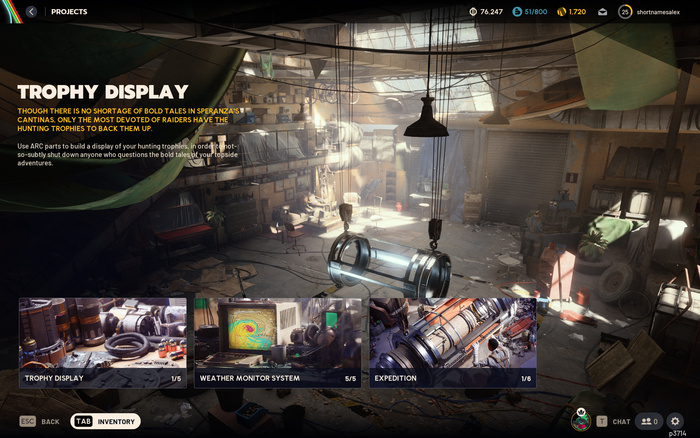 The Projects menu, which acts as additional high-stakes goals for players to grind materials, submit them and receive rewards