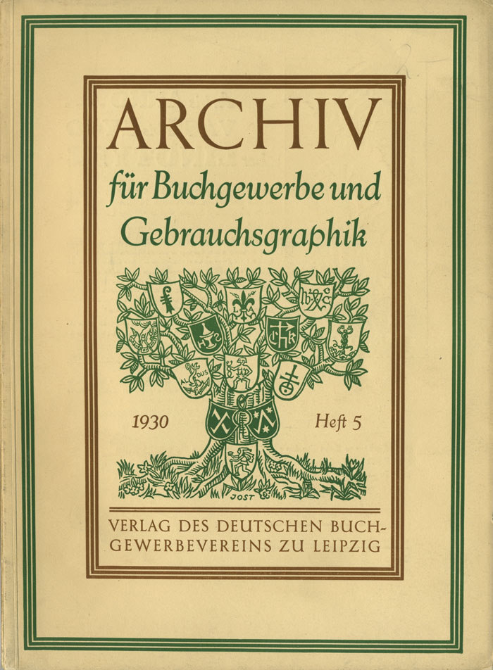 The cover of Archiv für Buchgewerbe und Gebrauchsgraphik 5/1930 was designed by Heinrich Jost (1889–1948), typographer, type designer, and long-time art director of the Bauer Type Foundry in Frankfurt/Main. His illustration of a tree adorned with various heraldic emblems and other symbols is paired with text set in Jost-Mediaeval (with Jost-Kursiv). Interestingly, this oldstyle wasn’t released with Jost’s employer, but with local competitor Ludwig & Mayer. It was first cast in 1927, four years after he started working for Bauer. In 1955, the typeface was relaunched under the name Aeterna.