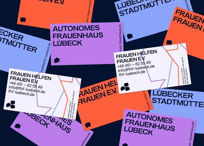 Designed by studiokwi, the joint identity system for Frauen helfen Frauen e.V. (“Women Helping Women Association”) and their projects Autonomes Frauenhaus Lübeck (“Autonomous Women’s Shelter Lübeck”) and Lübecker Stadtmütter (“Lübeck City Mothers”) is a thoughtful study of colour and accessibility.
