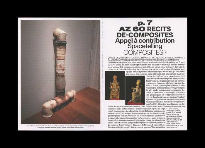 Focusing on contributions that explore composites as art and design forms, as research methodologies and practices, and/or as theoretical concepts, issue 60 of the review Azimuts – Design Art Recherche proposes that composites can be understood as a mode of presentation or representation of realities. Different hypotheses have been explored by the researchers and creators gathered here.