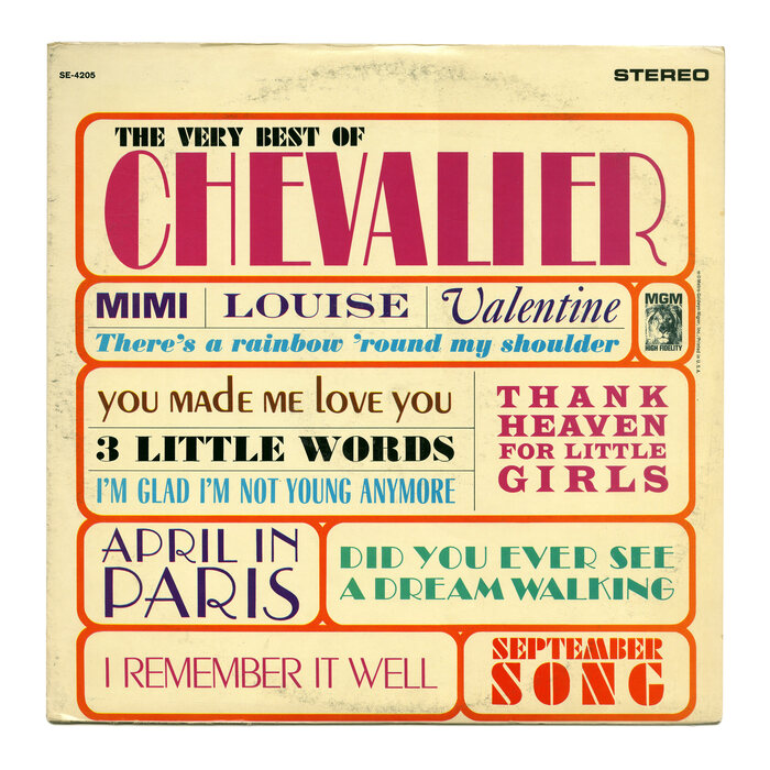 This compilation with “The Very Best of Chevalier” brings together a dozen hits by French singer, actor, and entertainer Maurice Chevalier (1888–1972), including “Valentine”, “Louise”, “Mimi”, and “Thank Heaven for Little Girls”. It was released in 1964 by MGM Records.