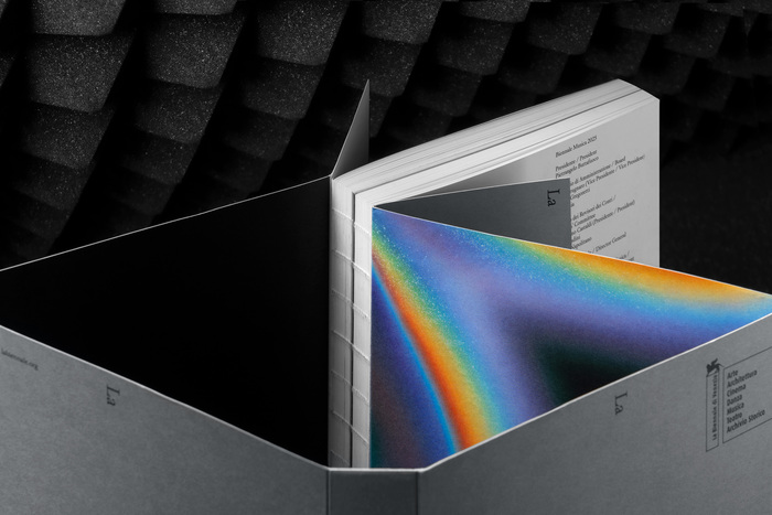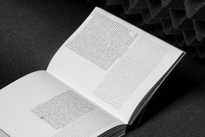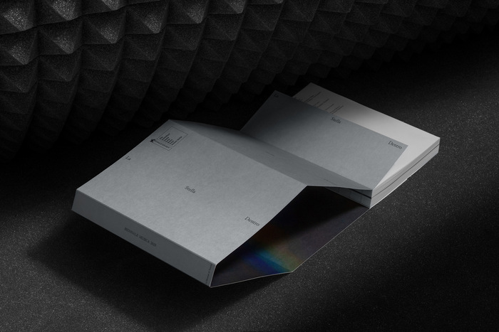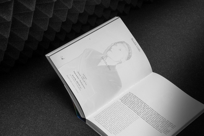 The typography, on the other hand, interprets the link with the refined tradition of classical music, with a font inspired by the work of Jean Jannon, Robert Granjon and Philippe Grandjean and other – it’s Store Norske Gangster, designed by Arve Båtevik. Used very often in italics and in very small sizes, it creates an interference with the electronic and intergalactic aesthetics of the catalogue and the ‘Biennale’.