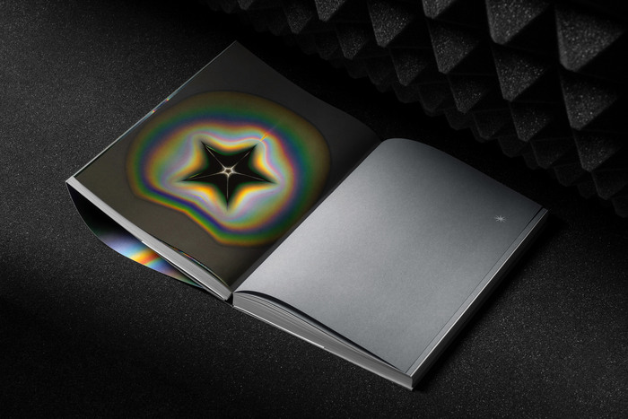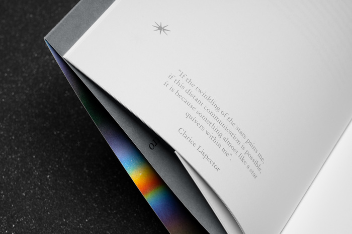 Thus, the catalog, designed by Tomo Tomo, conceals a colourful, psychedelic star within its austere, sidereal cover, and the object itself changes and expands in the hands of those who leaf through it, expressing the dynamics of sensory expansion. Except for a sixteenth of ‘stellar’ images, the book is printed entirely in a silver spot color with a few elements in black and a large amount of white space. Cold, electronic, rarefied.