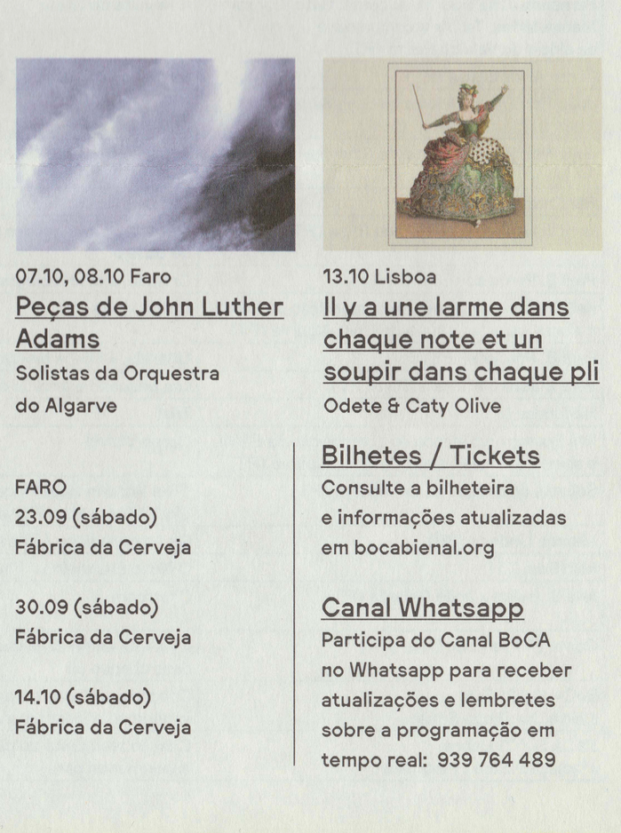 Between commissions, world and national premieres by both established and emerging artists, performing in their own language or taking risks to create for other registers, BoCA built its 4th edition on the idea of “Invisible Present”.