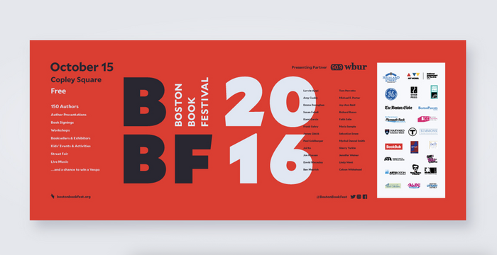 The Boston Book Festival rebrand in 2016 was designed by Elizabeth Carter at Corey McPherson Nash, using Mallory by Frere-Jones Type.