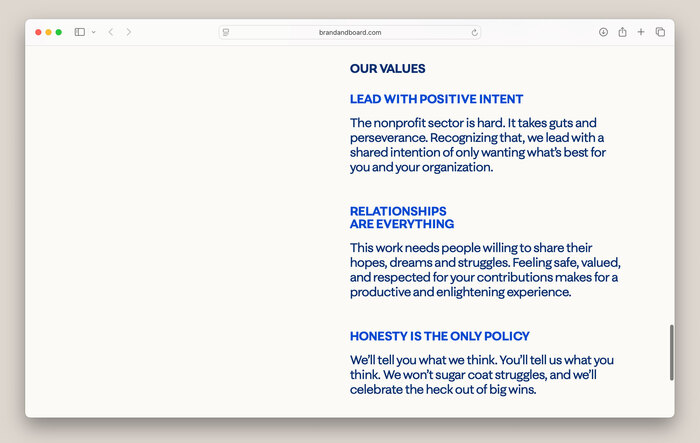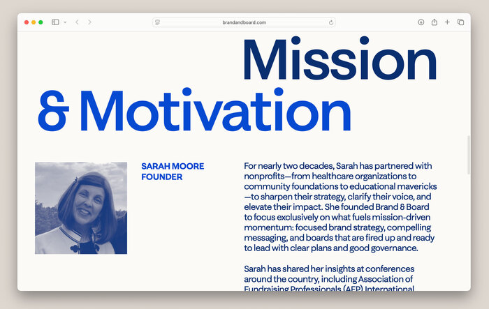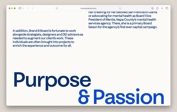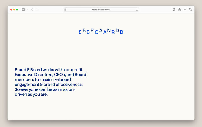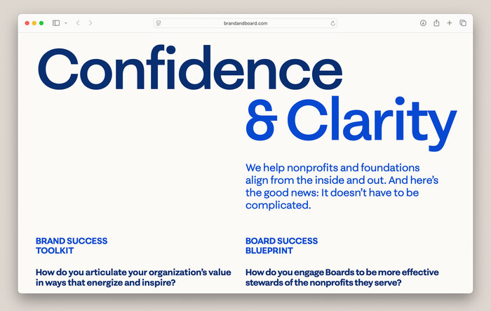 Brand & Board works with executive directors, CEOs, and board members of non-profits to strengthen board engagement and brand effectiveness. The typography-driven identity features Sprig Sans, a geometric grotesk whose friendly tone balances clarity with approachability.