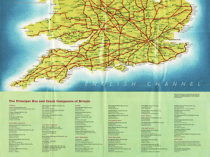 Southern section of the map. The list of principle bus and coach companies of Britain is set in two weight from Monotype Grotesque.