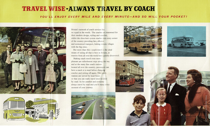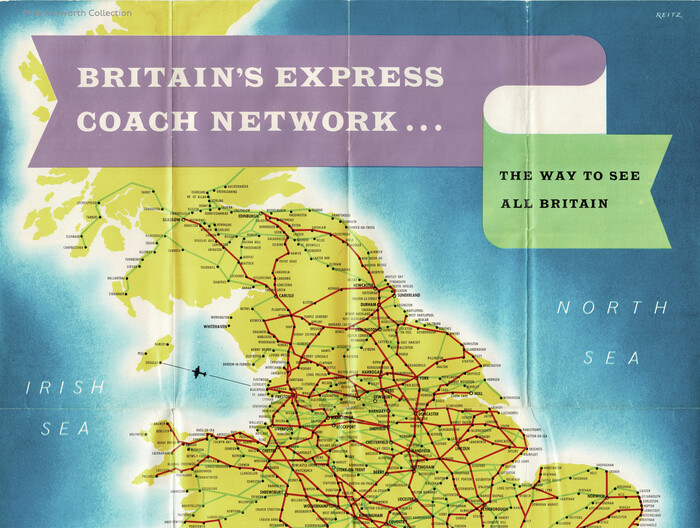 A rather fine and complex folding map giving details of the many express motor coach routes operated in England and Wales by the ‘principal’ bus and coach companies, a list of which appears at the base of the map. The folder gives information as to express services, coach holidays, chartering, sightseeing and coach-air services and is illustrated by images of suitably express coaches and happy passengers. The folder was issued at a time of great popularity for both express coach services and coach holidays – post-war years that still saw relatively low car ownership but with increasing wages and disposable income and before the onset of cheaper overseas holidays.