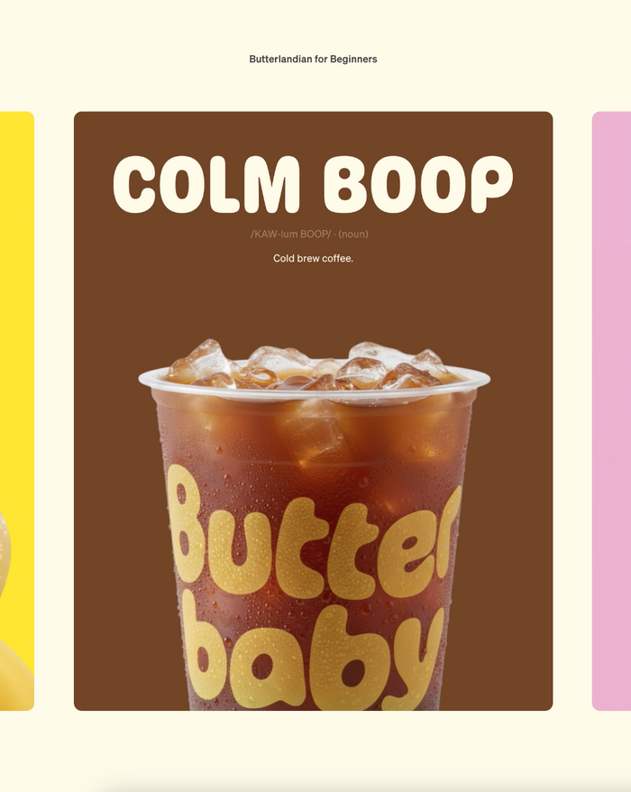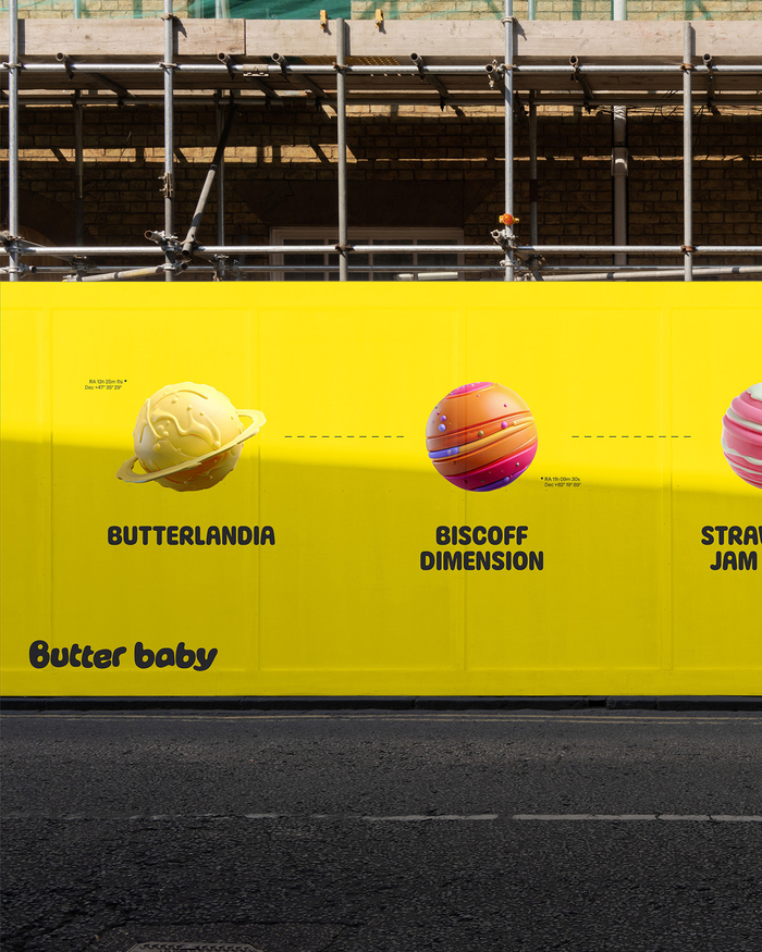 Our task was to take our client’s initial narrative, build in lore, craft the Butter Baby character, and transform it into a distinctive and out-of-this-world brand identity. Butter Baby’s hero typeface is OZIK Soft, a playful display font that feels expressive without tipping into childish. Its rounded forms feel contemporary while also nodding to Butter Baby’s own soft, rounded character. Our supporting typeface is Söhne. It is functional, highly legible, and provides balance to the more expressive display.