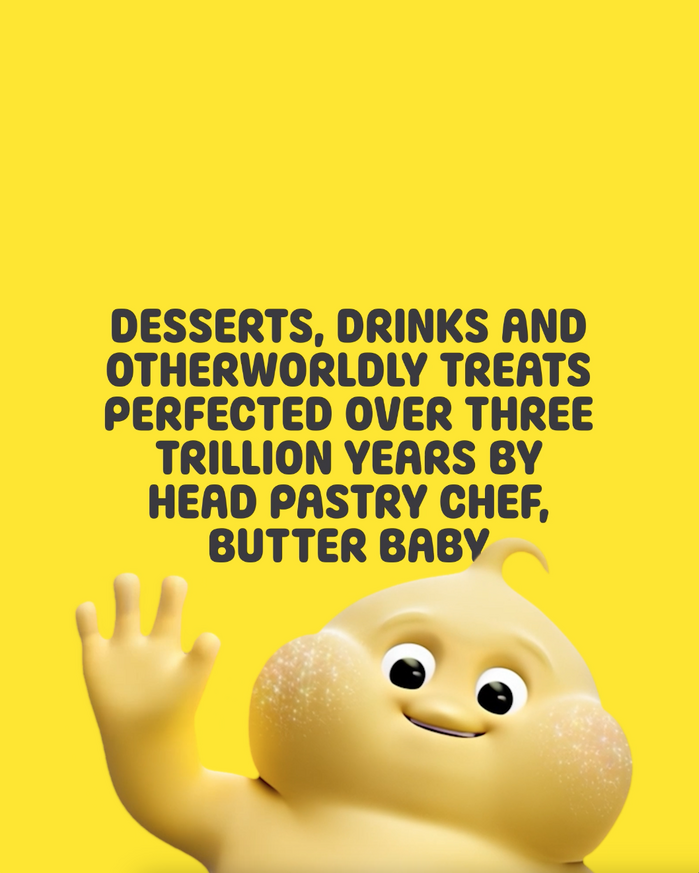 Butter Baby, a brave explorer from the paradise planet Butterlandia, travelled through space to save his home. He discovered weird and wonderful worlds before eventually crash-landing on Earth, where he found rich, abundant butter and friendly humans, or as he called them ‘humblabubs’. Captivated, he decided to stay and share his traditional Butterlandia treats from his humble store in Blok M, Jakarta.