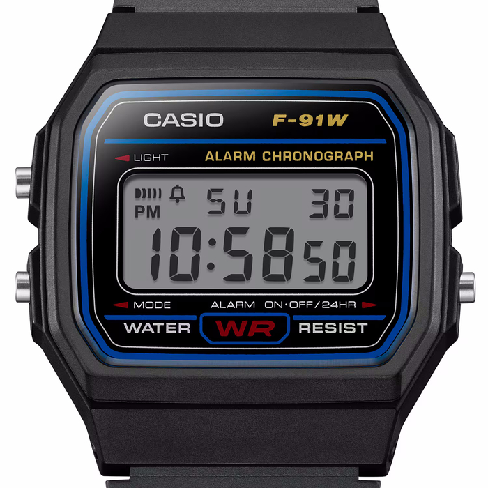 The humble, ubiquitous yet legendary Casio F91-W – a digital watch worn by virtually everyone from middle-school students to world famous celebrities – utilizes a lot of text on its case that quickly describes its features and controls.