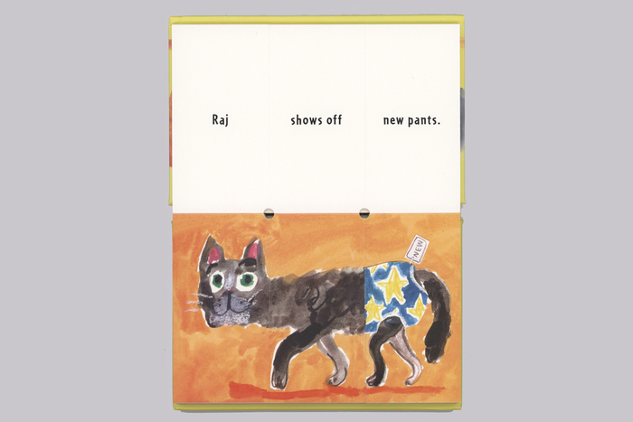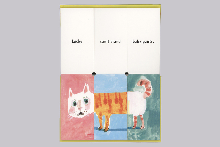 Each page is equally divided into three parts so that the head, body and (clothed) tail-end of the cat can be swapped around with the respective parts from other pages to create a huge number of cats.
