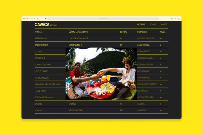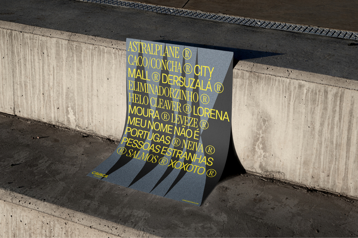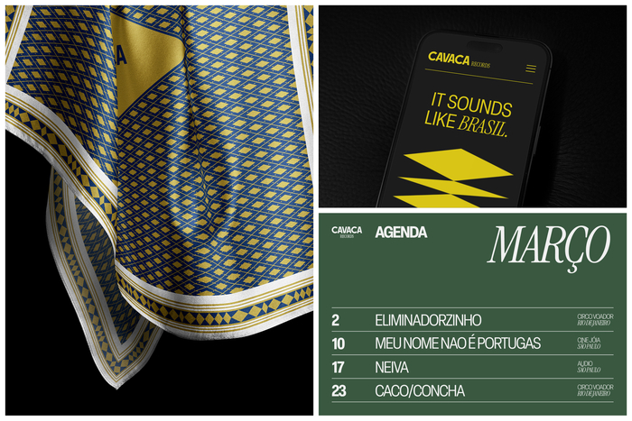 The concept of modularity and movement is central to the typography. The custom-drawn Cavaca logo was built manually from the flag’s geometry, featuring a modular architecture where the suffix “Records” can be substituted for future business units like “Festival” or “Store“. This structural solidity is contrasted by the refined, hand-adjusted ligatures of Instrument Serif, used for the logo’s subtitle and secondary communication to add elegance. To anchor the system, Elza—a Brazilian neo-grotesque—serves as the primary typeface, providing a modern and local character. Together with a circular animation behavior for the logo and icon that mimics a spinning record, the identity stands as a proprietary system designed for continuous growth.