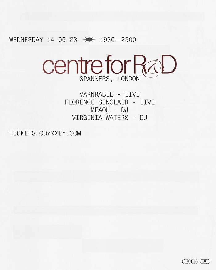 Centre for R&D is an event that will take place at Spanners, South London, on June 14th, 2023. Promoted by odyXxey, it will include live performances by Varnrable and Florence Sinclair as well as DJ sets by mea0u and Virgina Waters.