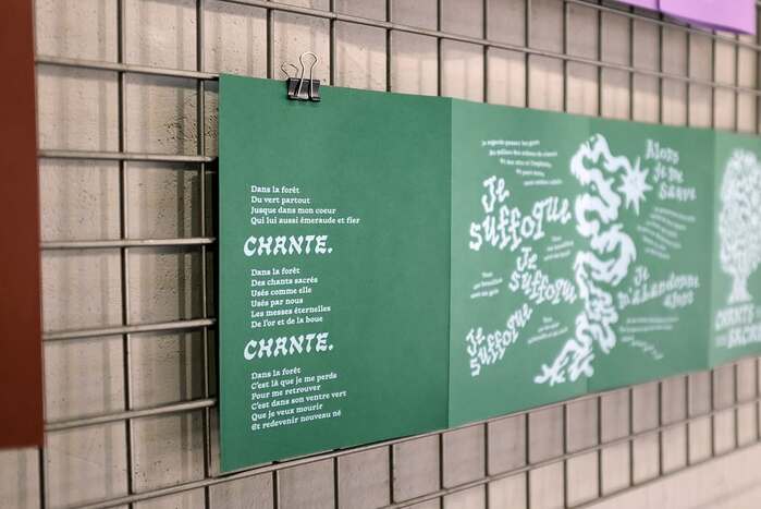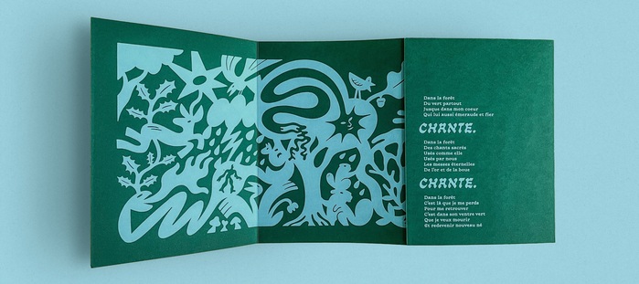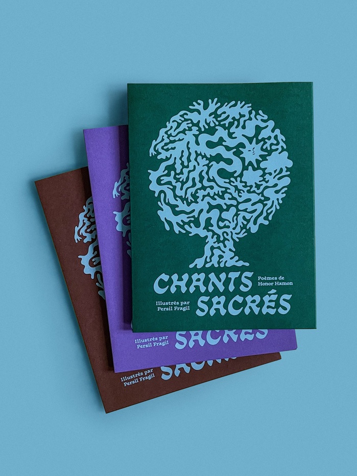 Chants sacrés is a leporello created by illustrator Pierre-Alexandre Prod'homme ( Persil Fragil). This editorial object, designed for the Cheminement exhibition at La Safe Place (Nantes), explores the quest for self through forest wanderings and a reconnection with the elements. Born from a poetic collaboration with the author Honor di Hamon, the piece stands out for its handcrafted finishing and screen-printed execution. The printing was expertly handled by Alexis Grasset at the Projeta studio.
