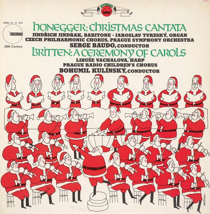 First released by Supraphon in Czechoslovakia in 1966, this is the cover of the 1967 issue by Crossroads, a short-lived subsidiary of Epic Records. The A-side has twelve carols composed by Benjamin Britten and performed by the Prague Radio Children’s Chorus. Arthur Honegger’s Christmas Cantata on the B-side features the Czech Philharmonic Chorus and the Kühn Children’s Chorus.