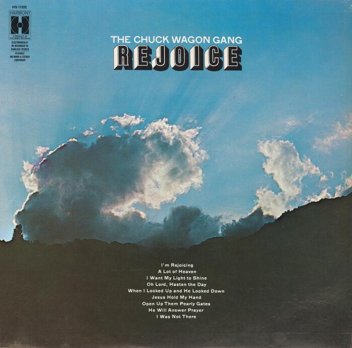 The Chuck Wagon Gang’s album Rejoice was released in May 1969 on Harmony Records. It is a gospel/sacred music album, as evidenced by the inclusion of the track “I’m Rejoicing”. On the cover, Baby Fat is used for the title while the band name above and the song list below are set in Lining Gothic. Cover photography by Ira Friedlander, who may have worked on the typography as well.