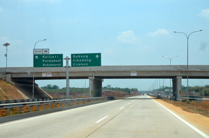 The standard typeface for road traffic signs in Indonesia is Clearview (Terminal Design), just like in the the United States, Brazil, Canada, Israel, the Philippines, and Sri Lanka. It’s also used for the toll gate directional signs on the Cikopo–Palimanan Toll Road which opened in June 2015 as part of the Trans-Java Toll Road network.