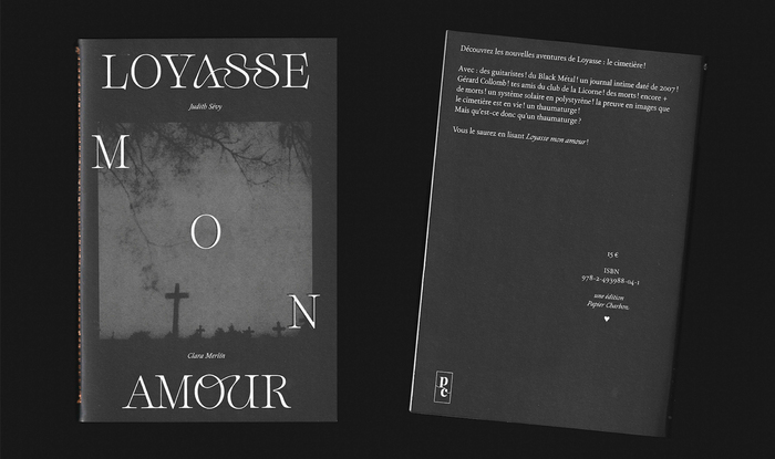 48 pages, riso-printed in Vaulx-en-Vlein by Toner Toner. The cover was screen-printed by Sacrés caractères at Atelier Garage, Lyon, and the book was bound with copper thread by Judith, Clara and Cecilia at publisher Papier Charbon.