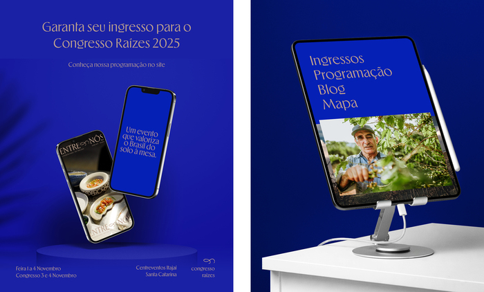 Applying the personality of the color blue, already present in the previous brand, we reinforced the values of bringing together the expert and enthusiast audience to develop gastronomy at all points in the chain in a new icon, including the new language for photographic direction and applications in the Raízes brand's digital products.